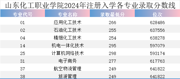山东化工职业学院2024年注册入学各专业录取分数线