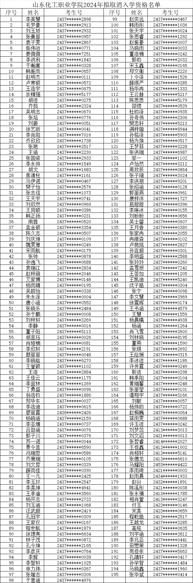 根据《山东化工职业学院学籍管理实施细则》第二章第三条规定,因故需延期报到者,由学生在开学前一周内以书面形式连同相关的证明材料,向所属二级学院请假,请假不得超过两周。未请假或请假逾期一周不报到者,视为放弃入学资格。经辅导员与学生联系确认、学院审核,拟对2024年我校录取的195名未报到入学学生进行放弃入学资格处理。现将拟取消入学资格学生名单进行公示。