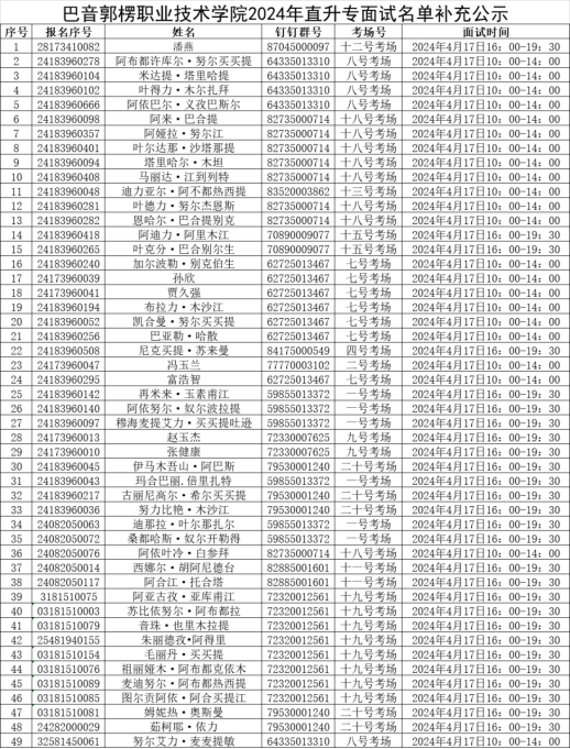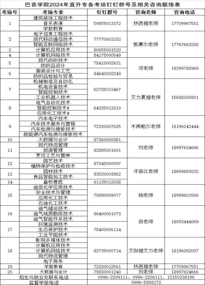 根据我院巴音郭楞职业技术学院2024年优秀中职毕业生直升高职(专科)(以下简称“直升专”)报名及线上面试工作安排,现对我院2024年直升专补充面试名单予以公示,请名单中的学生根据我院考场安排在4月16日16:00前使用本人手机登录钉钉,在下表中查找自己所在考场群号,钉钉搜索该群号,查找公开群组,备注 “序号+姓名+电话”,申请加入考场钉钉群,并按要求填写(核准)相关信息,并按照班主任要求打印准考证。