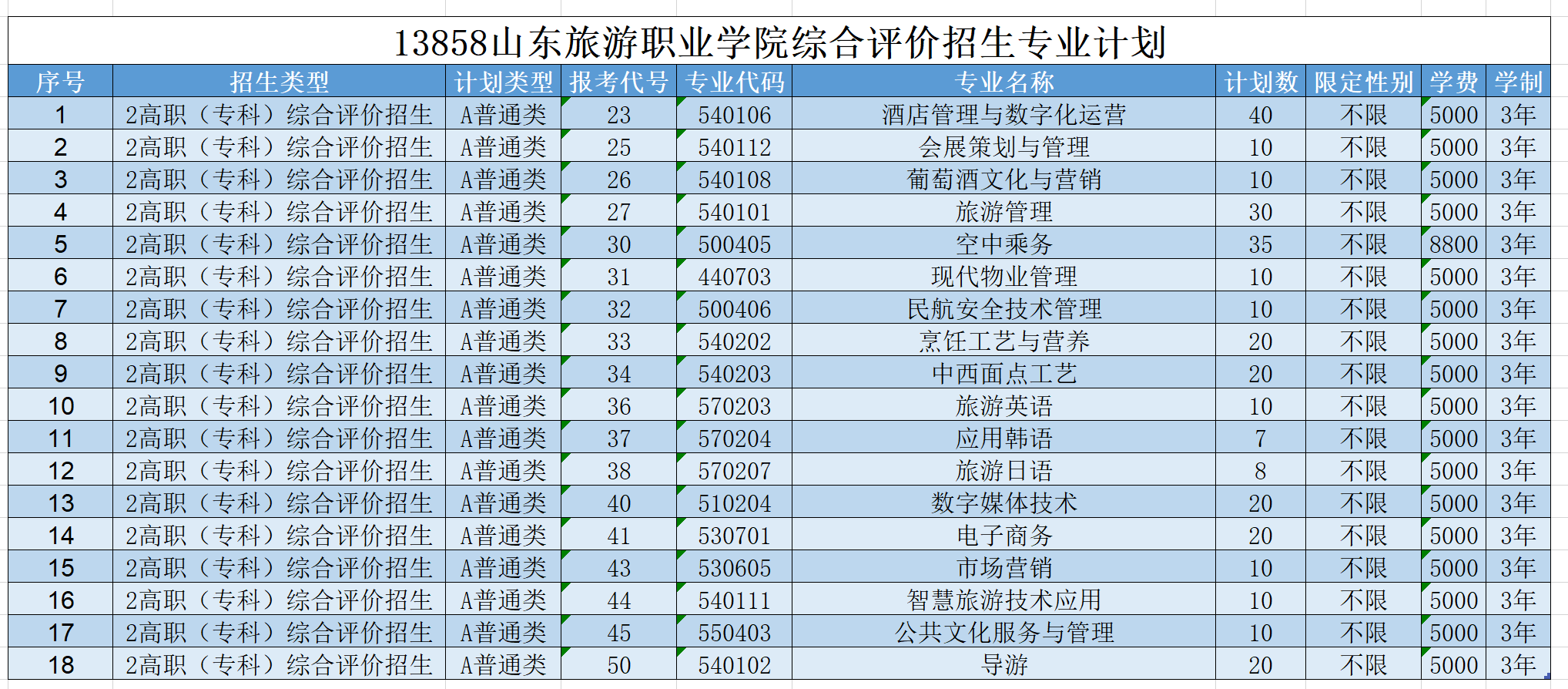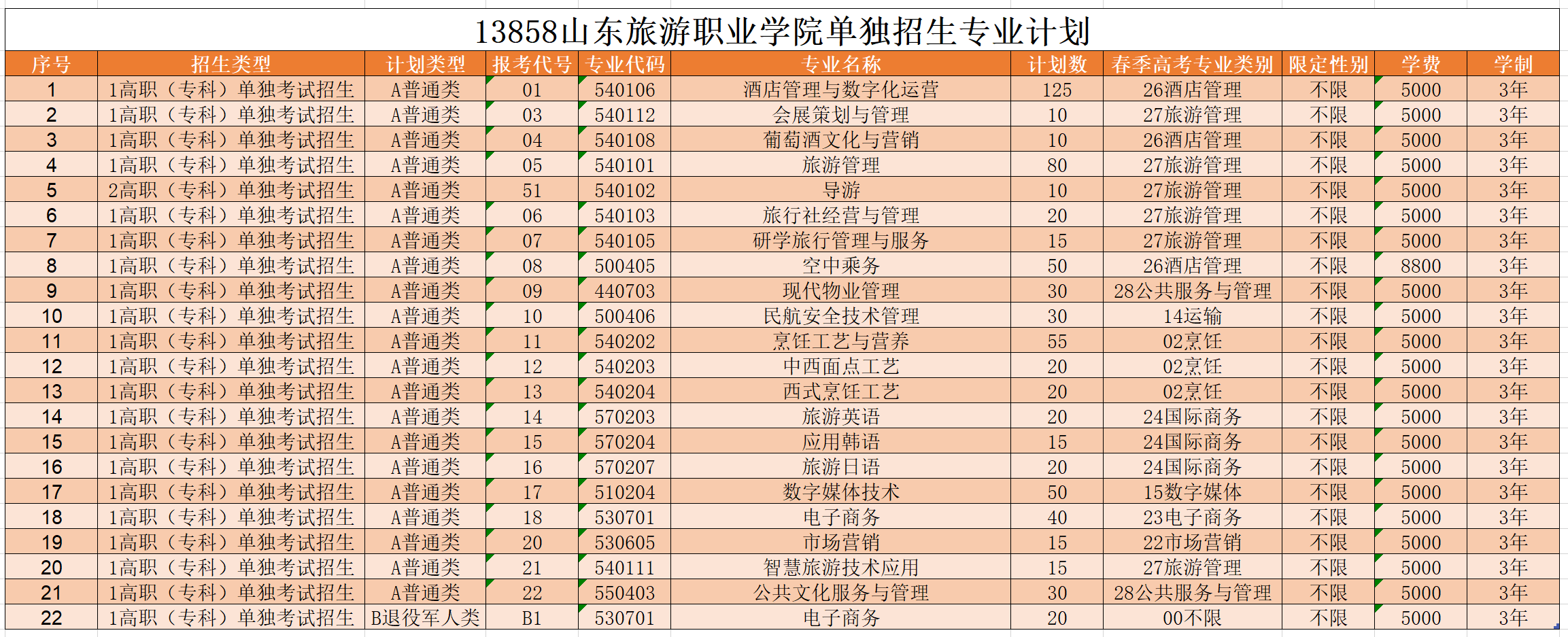 山东旅游职业学院2023年单独招生(普通类)计划680人、单独招生(退役军人)计划20人,综合评价招生计划300人,总计划1000人,具体分专业计划以山东省教育厅审核为准。
