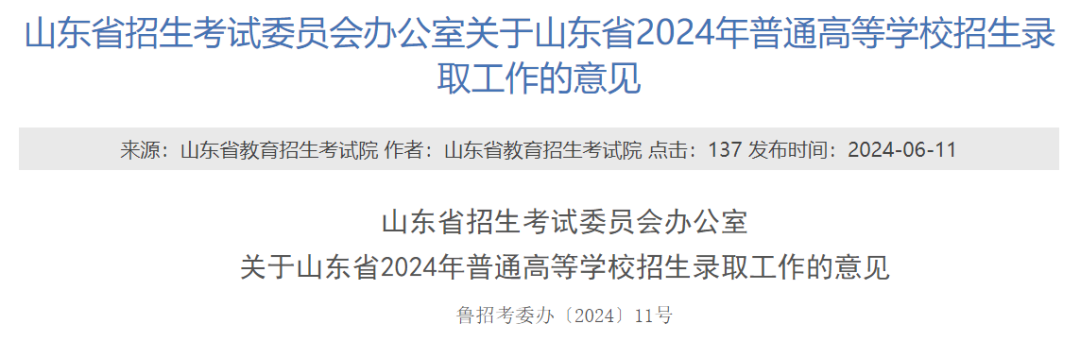 为做好我省2024年普通高等学校招生录取工作,根据教育部有关文件和《山东省招生考试委员会关于做好2024年普通高校招生工作的通知》(鲁招考委〔2024〕2号)、《山东省招生考试委员会办公室关于印发<山东省2024年普通高等学校考试招生工作实施办法>的通知》(鲁招考委办〔2024〕2号)等文件要求,制定本意见。
