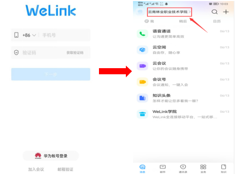 完成账号激活后,使用绑定的手机号码登录WeLink,查看是否已进入“云南林业职业技术学院”组织机构中,如图6所示,进入后即可使用相关功能。
