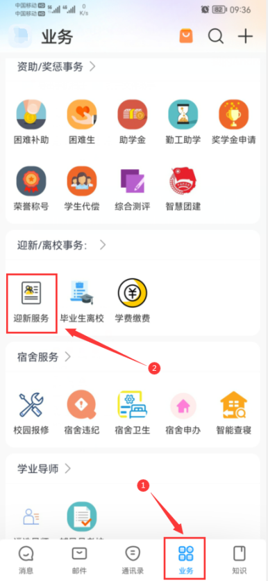 4.绿色通道办理。有贷款、西盟农村籍、西藏免补专业学生及家庭困难暂缓缴学费学生,登录WeLink点击“业务”模块,在“迎新/离校事务”栏目中点击“迎新服务”,选择“绿色通道”即可,如图10所示。
