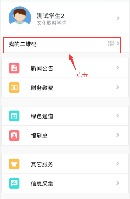 5.就读学院报到。点击“我的二维码”调出个人信息二位码,并出示二维码给学院老师扫码办理报道,如图11所示。