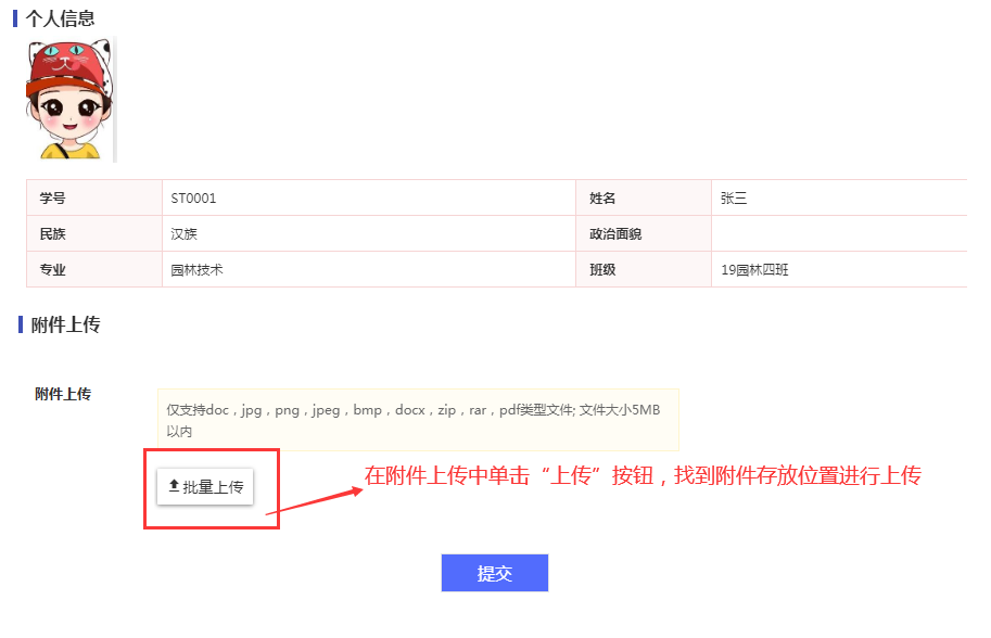 在“附件上传”栏目中单击“附件上传”按钮,依次将本人身份证正面及录取通知书作为附件上传,点击提交保存。