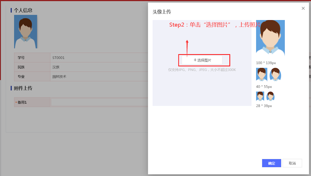注意:照片上传的大小不能超过300k,照片要求2寸照片,图片清晰。