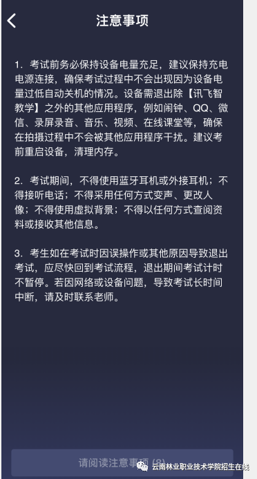 各位考生:云南林业职业技术学院2024年单独考试招生采用“讯飞智教学”APP进行网络无纸化考试,不进行线下考试,为确保单招考试顺利开展,现就此次单招考试做如下要求与说明: