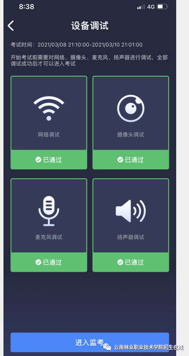 7.设备调试。网络、摄像头、麦克风、扬声器分别都点一下,使图标都变成绿色,未变成绿色将直接影响考生考试,请务必确认保证图标变绿。