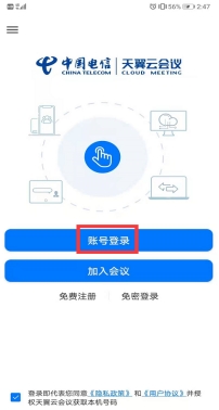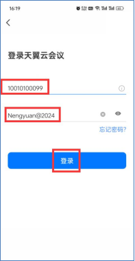 2.运行天翼云会议APP,进入后点击“帐号登录”,帐号为:“10”加“考号”,例如:考号010100099,登录帐号为10010100099,密码统一为:Nengyuan@2024,点击“登录”。登录后请勿修改密码。