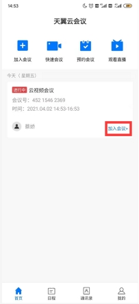 3.进入首页中点击“加入会议”,若无会议下拉刷新后可见。