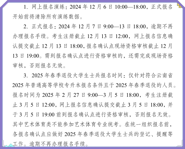 为切实做好云南省2025年普通高等教育专科层次起点升本教育的招生工作,省教育厅制定了《云南省2025年普通高等学校专升本统一考试招生工作办法》和《云南省2025年普通高等学校专升本免试招生工作办法》。