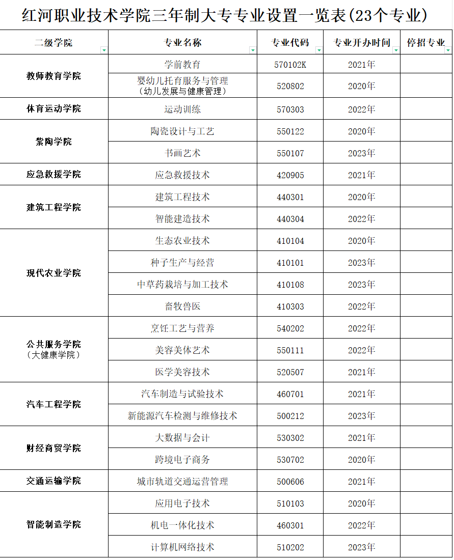 红河职业技术学院三年制大专专业设置表(2023年)