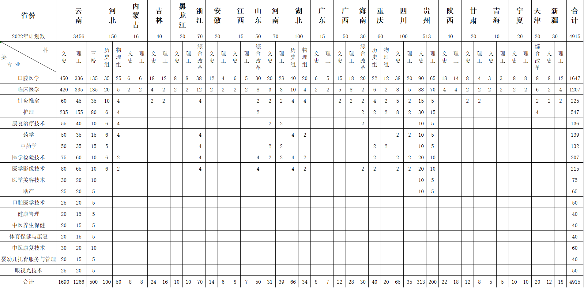 2022年普通专科招生计划