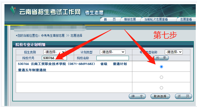 7、输入院校代号“例:530766云南工贸职业技术学院”,点击“检索”按钮,选择“普通类五年制普通批”,点击“确定”。