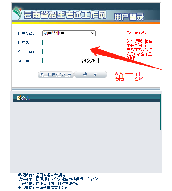 进入“用户登录”页面,用户类型选择“初中毕业生”,按提示输入“用户名、密码、验证码”,点击“确定”进行登录。