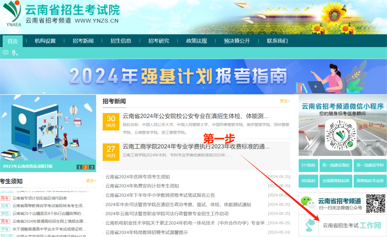 1、登录云南省招生考试院官网https://www.ynzs.cn/,点击“云南省招生考试工作网”。