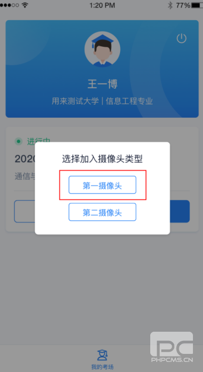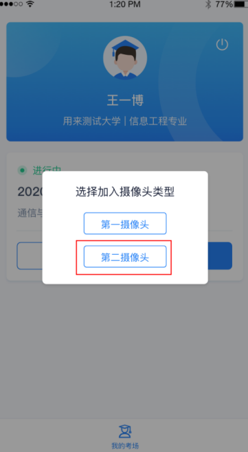 - 同意承诺书的内容后,就可以进入候考区了,进入时可选择以哪个机位的摄像头加入(不要重复加入同一个机位的画面)