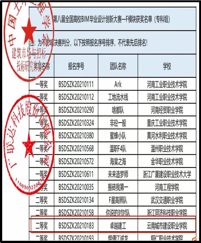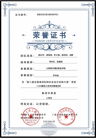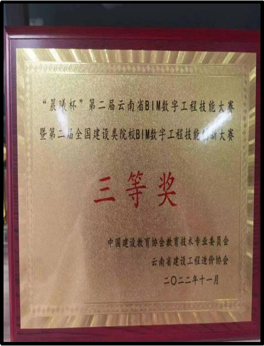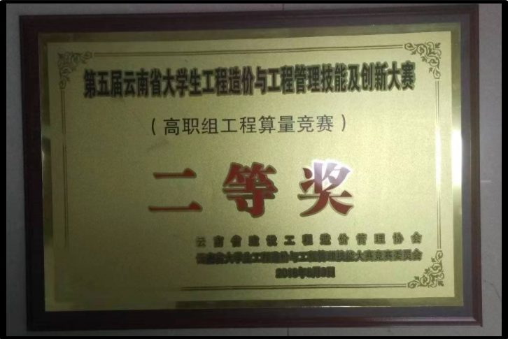 2017年组织学生参与第四届广联达杯云南省大学生工程造价与工程管理技能大赛,分别荣获二等奖和三等奖。2018年组织工程造价学生参与第五届广联达杯云南省大学生工程造价与工程管理技能大赛,荣获二等奖。2020年组织工造学生参加云南省职业院校技能赛,荣获手工算量三等奖。2021年工程造价教研室组织工程造价和工程管理专业学生参加“第七届全国高校BIM毕业设计创新大赛BIM建设工程管理应用模块”,荣获三等奖。2022年组织工程造价专业学生参加“晨曦杯”第二届云南省BIM数字工程技能大赛荣获三等奖。2022年组织工程造价和建设工程管理专业学生参加“第八届全国高校BIM毕业设计创新大赛BIM建筑工程管理应用模块”,荣获二等奖。