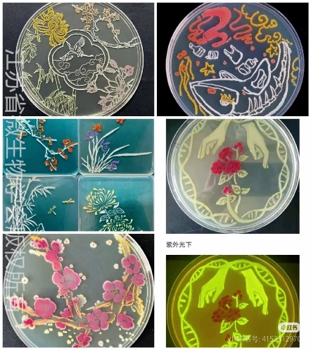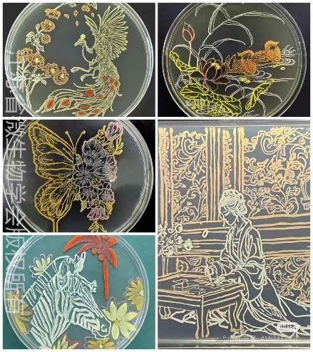 通过含有荧光蛋白的细菌(无毒无害)进行作画,使其在生长过程中培养并完成绘画创作,将培养皿变成画布,实现荧光微生物与艺术的完美结合。
