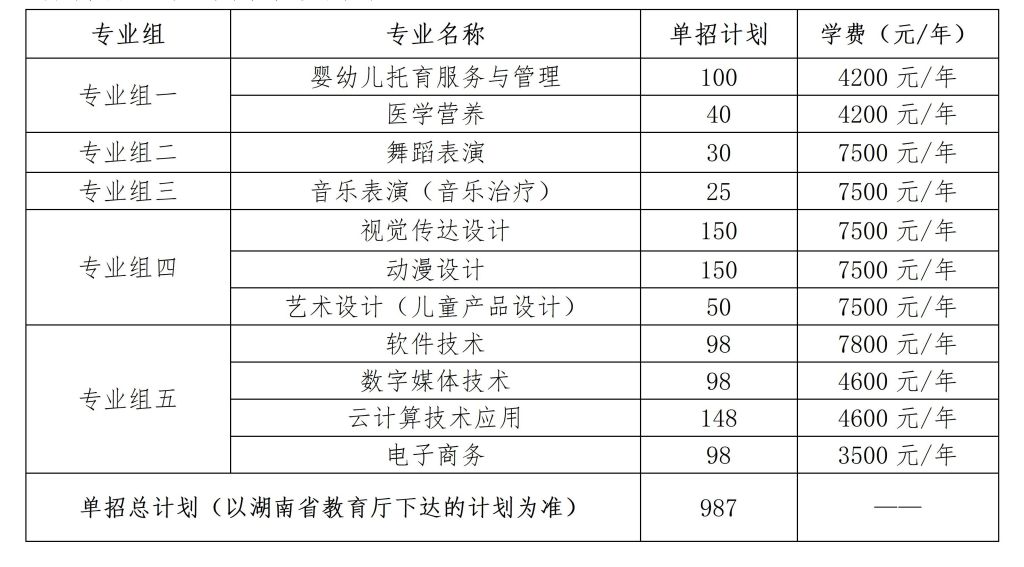 我校2025年单招总计划数为987人,其中包含单列计划的退役军人5人、体育特长生10人。本校2025年招生专业共11个。分专业单招计划及学费标准如下表,各专业最终学费标准以2025年湖南省物价主管部门审核为准。