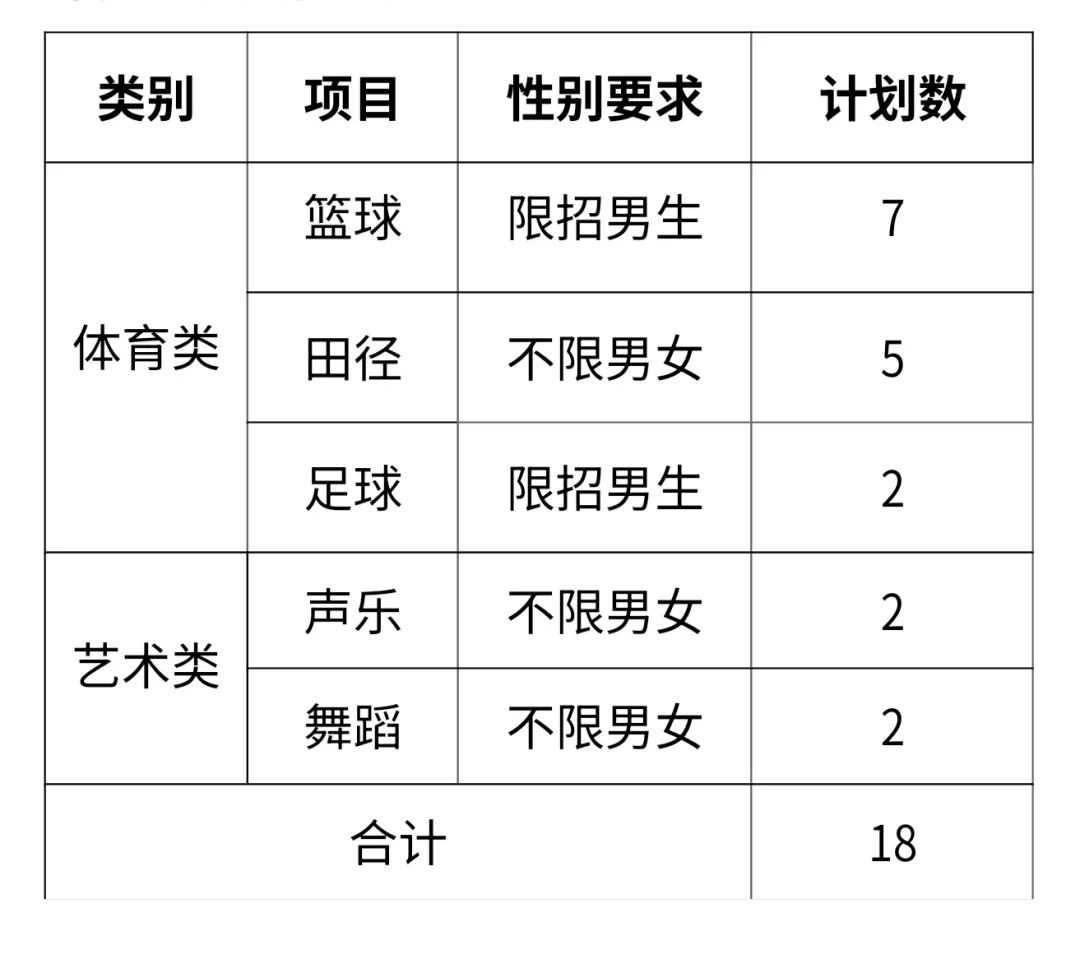 我校艺术、体育特长生招生计划严格按照湖南省教育厅有关规定执行,计划总数18人。其中艺术特长生计划6人,体育特长生计划12人。具体各项目计划如下