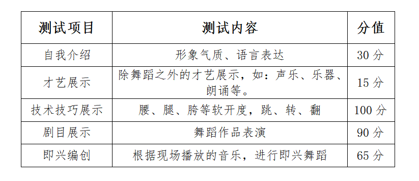 才艺展示 | 除舞蹈之外的才艺展示,如:声乐、乐器、朗诵等 | 15分 |