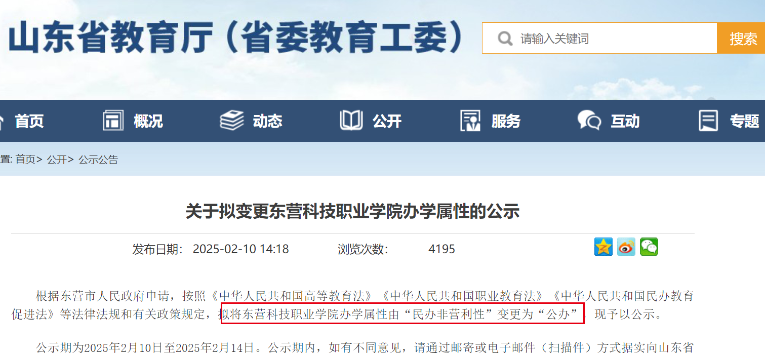 近日,山东省教育厅发布了一则重要公示,拟将东营科技职业学院的办学属性由“民办非营利性”变更为“公办”。标志着东营科技职业学院在教育体制上的重大转变。