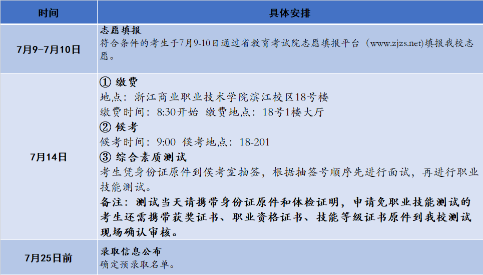 第十一条 测试方式:无文化课考试,采用“面试+职业技能测试”的方式进行综合素质测试,测试总成绩为100分。其中面试成绩满分50分,职业技能测试成绩满分50分,测试方案详见招生信息网《浙江商业职业技术学院2019年面向退役士兵、下岗失业人员等高职扩招单独考试综合素质测试实施方案》,对符合免职业技能测试的考生仅参加面试。