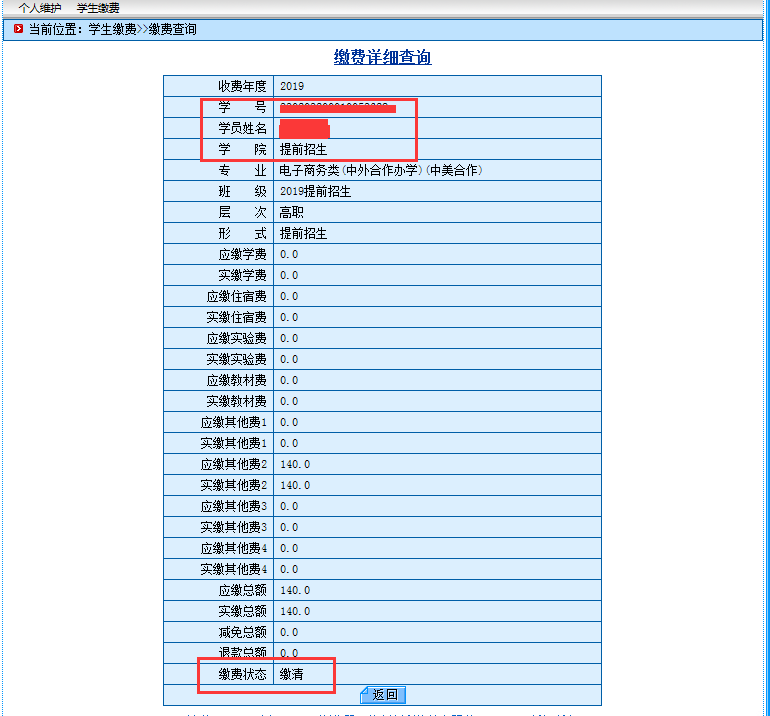 在用户名中输入身份证号,密码中输入“Szy+身份证号后4位”,类型中选学生,点击登录,选择学生缴费--缴费查询--查询,显示学生缴费详细信息。