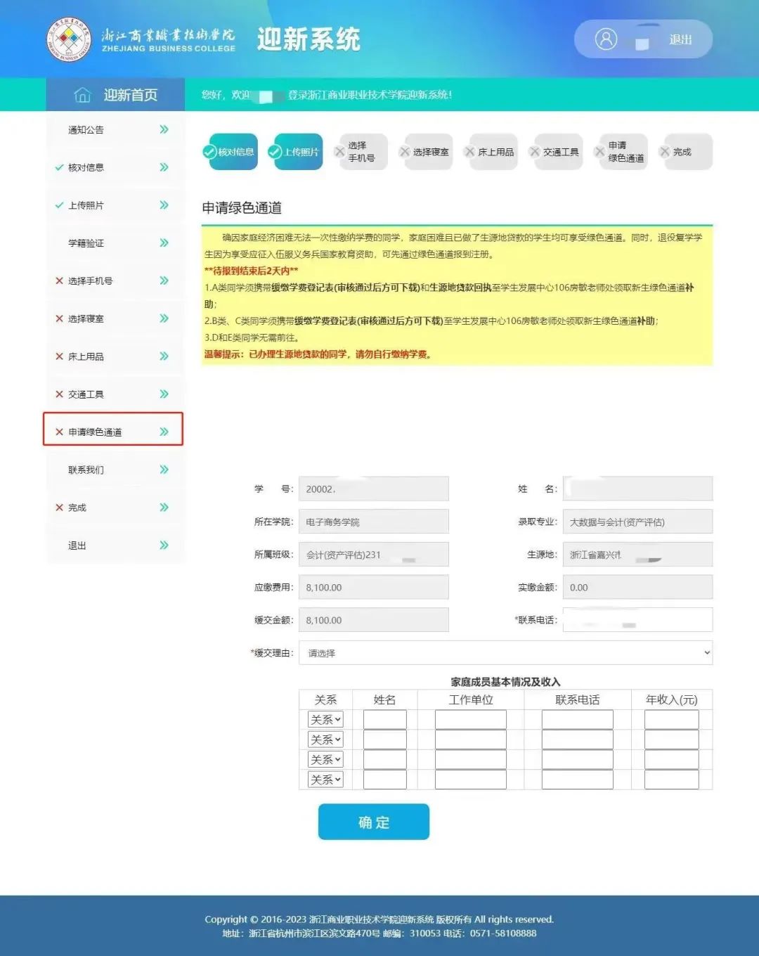 申请绿色通道:同学们根据实际情况,如需申请绿色通道,请于9月25日下午17点前,在迎新系统中完成绿色通道申请(主要针对家庭经济困难学生或退役复学学生)。请已做生源地贷款的同学将个人回执码备注在申请理由中,以便及时录入国开行系统;未做生源地贷款,但家庭经济困难的同学可携带相关证件(低保证、残疾证、孤儿证等)或材料入校后申请校园地国家助学贷款。绿色通道申请具体操作如下: