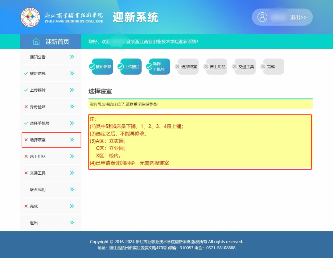 选择寝室:寝室资源按照班级男女生总数分配,新生可登录迎新系统网上选床位,未在网上提前选择床位的新生,报到当天由学院随机产生寝室及床位,选择不能更改。具体时间另行通知,请大家耐心等待。