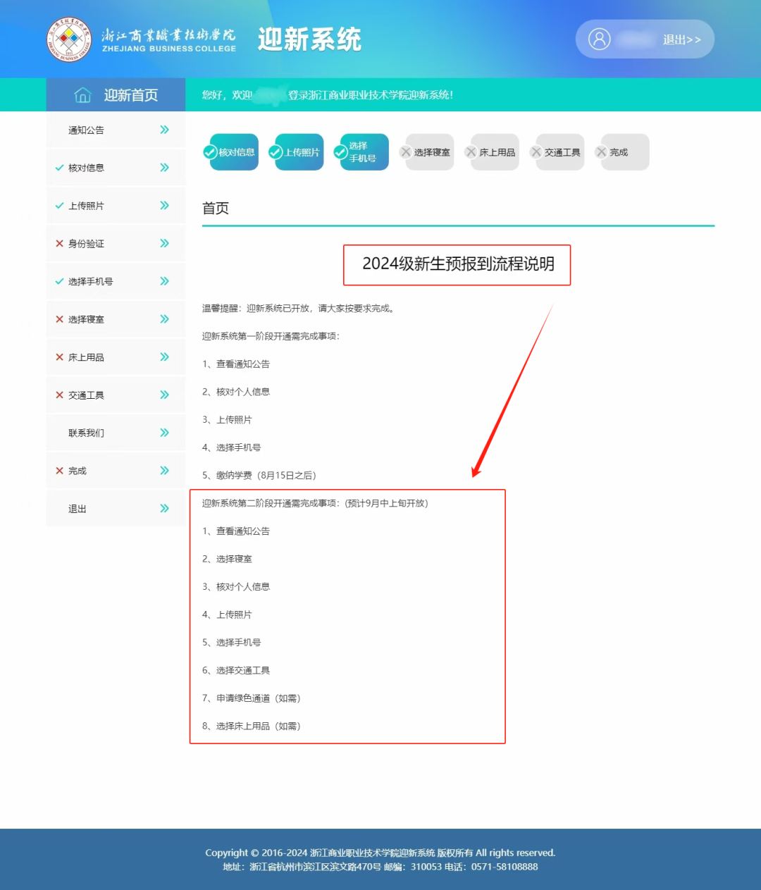 迎新系统第二阶段将于9月24日上午9:00开放,2024级新生登录迎新系统:https://apply.zjbc.edu.cn/yx/,并于9月26号前完成"网上预报到",包含核对个人信息、身份验证、申请绿色通道(如需)、选择交通工具、选择寝室(具体时间另行通知)等模块,详见迎新主页,迎新报到流程说明,如下图: