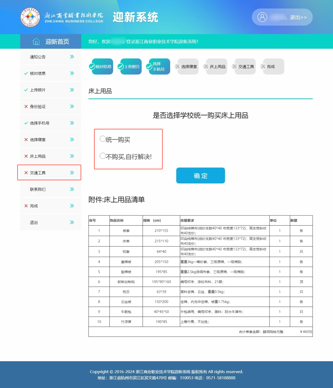 选购床上用品:大家可在此页面,结合自己实际情况选择是否统一购买学校床上用品。
