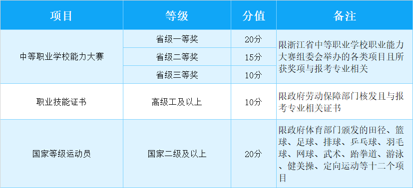 以上赋分为个人项目,其他所有团体项目成员按个人项目分值的50%计分。考生不同类项可累计赋分,但赋分最高分值累计不超过20分。素质特长项目赋分需经相关部门认定,学校招生领导小组审核后有效。