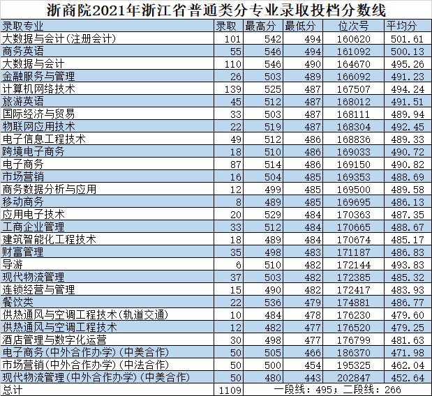 浙商院2021年浙江省普通类分专业录取投档分数线