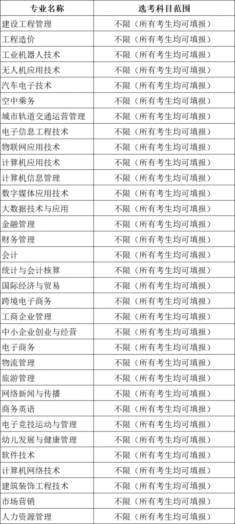 第十一条 浙江省统一高考各招生专业选考科目范围如下表: