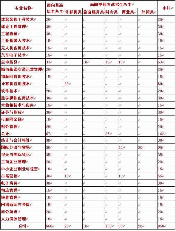 第八条 招生专业、科类及计划。招生专业29个,招生计划950名。面向普高招生考生计划660名,面向单独考试招生考生计划290 名,学制均为三年,具体专业计划如下表:
