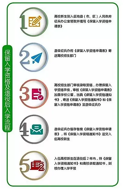 依据教育部、总参谋部《应征入伍普通高等学校录取新生保留入学资格及退役后入学办法(试行)》(教学[2013]8号)相关规定,2023年应征入伍的新生需携带录取通知书及相关材料至县级征兵办领取《应征入伍普通高等学校录取新生保留入学资格申请表》并办理保留入学资格手续,再将相关申请材料邮寄至我院。