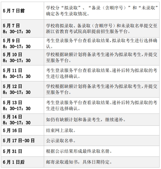 根据招生章程规定,考生须在5月9日规定时间内登陆浙江省教育考试院网站(https://pgzy.zjzs.net:4431/login.htm)确认录取结果。如有考生放弃拟录取,则缺失名额由备录考生根据备录顺序号依次递补为拟录取考生。递补后转为拟录取的考生需根据录取进程登录服务平台进行选择确认。放弃录取考生也需要登录系统确认。