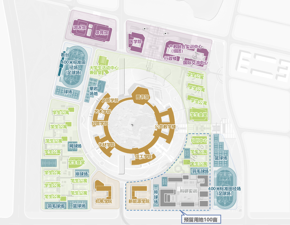 校园设计▼校园设计秉承与城市共享、与地域共荣、与自然共生、与未来共建的理念,以一芯一环三轴为组团,环环相扣,层层联系,努力打造布局合理、功能齐全的万人高校,并成为集教学科研、合作交流、生活保障、体育运动、绿色智慧为一体的“四省边际职业教育高地”。