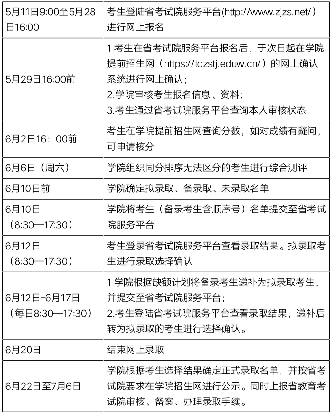 考生在浙江省教育考试院服务平台(以下简称:省考试院服务平台)上提交报名信息后,从次日起再登录浙江同济科技职业学院提前招生网(以下简称:学院提前招生网)进行网上确认。考生只有完成网上报名和确认两个步骤方为报名成功。