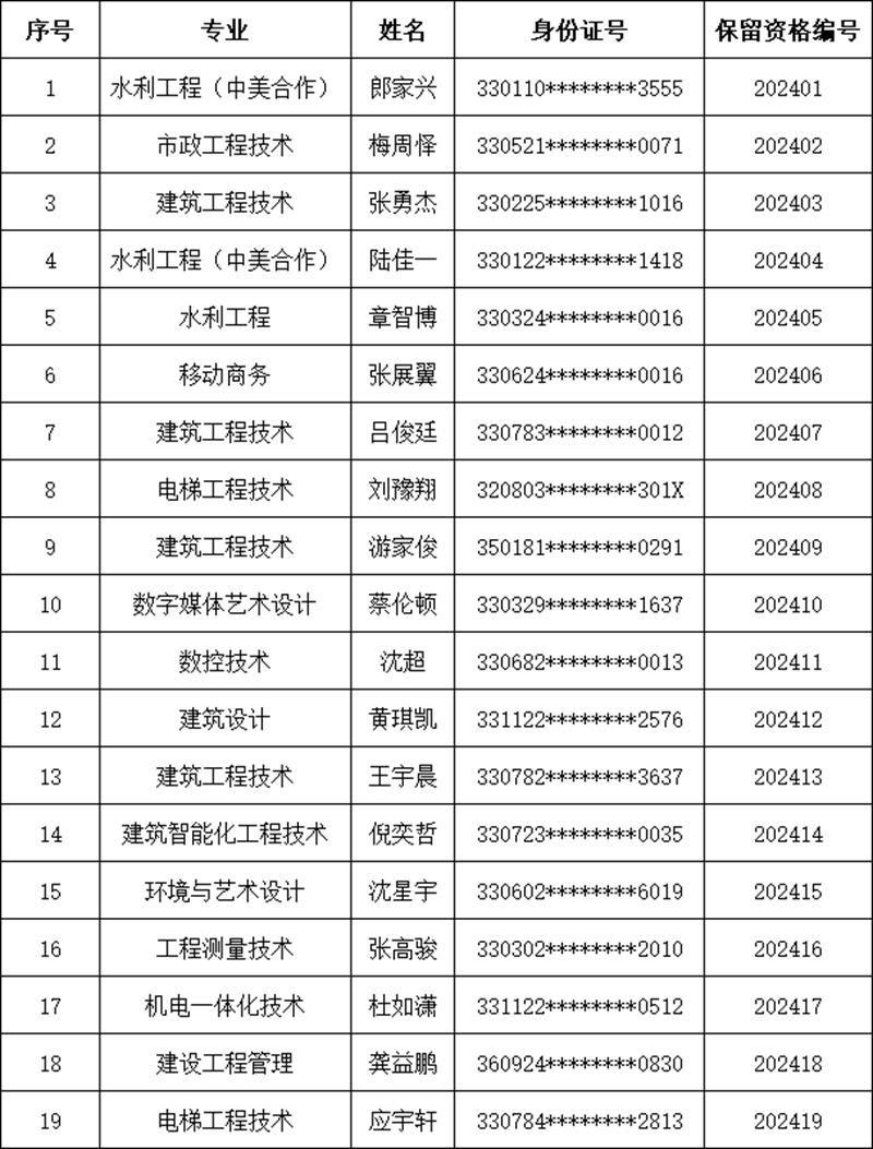根据《浙江同济科技职业学院学生学籍管理办法》(同科教〔2020〕81号)要求,现将2024级保留入学资格及放弃入学资格新生名单进行公示,并将有关事项通告如下: