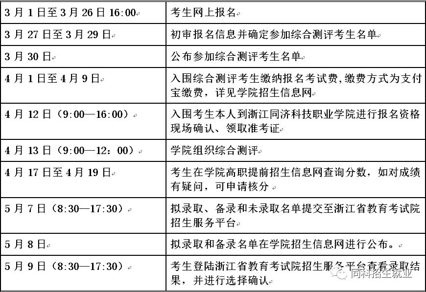 第八条报名条件:符合2019年普通高等学校招生考试或单独考试招生报名条件,并已办理当年报名手续,取得高考报名号的应届高中或中职毕业生,遵守中华人民共和国宪法和法律且在校期间无违纪处分记录(已撤销违纪处分的考生允许报考)、身体条件满足专业要求(详见第十四条)。 第九条报名采取网上报名、现场确认方式。 (一)考生申请报名 遵循本人自愿的原则,采取网上报名方式。凡符合学院高职提前招生报名条件的考生请于2019年3月1日—2019年3月26日16:00前,通过浙江省教育考试院高职提前招生服务平台(http://www.zjzs.net/)提交报名资料。 普高招生考生允许填报2个专业志愿,专业之间均可兼报;每位考生只能参加一个专业的综合测评。 单独考试招生考生允许填报1个专业志愿,只能填报与高职单独考试招生报名一致的科类,即艺术类只允许填报数字媒体艺术设计专业;建筑类只允许填报工程测量技术专业。 (二)确定入围综合测评考生名单 普高招生考生遵循“志愿优先”原则,根据高中学考成绩折算总分依次从高分到低分按照各专业招生计划的400%比例确定参加综合测评的名单;第一专业志愿不能满足的考生,若其第二专业志愿计划有缺额,则按学考成绩折算总分依次从高分到低分进行递补,额满为止,进入综合测评阶段后专业不能调整。 单独考试招生考生根据职业技能操作考试成绩总分依次从高分到低分按照各专业招生计划的400%比例确定参加综合测评的名单。报考人数少于专业招生计划的400%时,按实际报考人数入围。当最后一名折算成绩出现同分情况时,则同分考生全部进入测评环节。具体名单将在2019年3月30日公布在学院招生网,由考生自行查询,学院不再另行通知。 (三)现场资格确认 参加由学院对入围综合测评考生进行现场资格确认,确认合格学院组织的综合测评。已入围综合测评而不进行现场资格确认的考生视为报名无效。资格确认地点:浙江同济科技职业学院学生事务中心。现场确认时须提交以下材料,并按以下顺序装订成册,装订时以A4纸大小为标准。 (1)《2019年浙江同济科技职业学院高职提前招生报名表》,须加盖考生所在学校公章(作为材料首页,不需另制封面); (2)2019年《普通高校招生报名证》或《单独考试高职报名证》复印件; (3)考生本人身份证复印件; (4)素质特长分证明材料复印件1份(仅单独考试招生考生提供); (5)诚信考试承诺书(考生本人签名)。 入围综合测评的考生需缴纳报名考试费140元/人,缴费方式为支付宝缴费,2019年4月1日至4月9日考生通过学院招生网登录高职提前招生报名系统进行缴费,未按时缴纳报名考试费视为自动放弃。 现场确认提供的身份证、《普通高校招生报名证》或《单独考试高职报名证》、素质特长分证明材料等均需校验原件,因材料不全无法进行现场确认的考生,视作无报考资格。 | |||