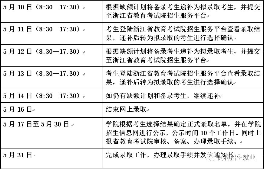 第十三条根据国家教育部和浙江省教育考试院要求,实行浙江省教育考试院监督、学院负责的体制,学院按公开、公平、公正的原则,择优录取。 第十四条考生身体健康要求参照《普通高等学校招生体检工作指导意见》的相关规定体检合格,能满足专业要求;凡考生体检符合“学校可以不予录取”条款的,学院将按“不予录取”执行;风景园林设计、数字媒体艺术设计专业色盲考生限报。 第十五条根据考生成绩的总分,各专业从高分到低分的顺序,按各专业计划数1:2.5 确定“拟录取”、“备录取”考生名单,其中前100%的考生确定为“拟录取”名单,顺延150%的考生为“备录取”名单,当“备录取”名单出现小数时,按小数点四舍五入确定。 第十六条当考生总分相同时,普高招生考生依次按职业适应性测试、学考语文、学考数学、学考2门必选科目+3门自选科目折算总分、学考物理、学考地理、学考10门科目折算总分的成绩排序录取;单独考试招生考生依次按素质特长分、职业技能考试、技能操作考试(工艺美术类科目为素描)、文化素质测试总分、语文的成绩排序录取。若仍相同,根据考生普高综合素质评价等级择优录取,高中阶段具备相关选修课程学分或相关选修课程成绩优良的,在同等条件下优先录取,具体由学院高职提前招生工作领导小组审定。 第十七条各专业实际参加综合测评考生人数少于或等于招生计划数,则按实际参加综合测评考生90%的比例确定拟录取考生的名单(小数点四舍五入计算),无备录取考生。 第十八条拟录取考生登陆浙江省考试院高职提前招生服务平台,选择一所院校作为录取结果,未在规定时间内登陆服务平台选定录取学校的考生视为自动放弃该批次所有拟录取资格。备录取考生根据录取进程、待转为拟录取状态后方可登陆平台进行录取选择。学院根据考生选择结果确定正式录取名单,并在学院招生信息网进行公示,公示时间10个工作日,同时上报省教育考试院审核、备案、办理录取手续。 第十九条凡被学院高职提前招生录取的考生,不得再参加当年的普通高校招生统一考试。未被录取的则可参加六月份的普通高校或高职单独考试招生统一考试,不影响正常录取。 第二十条学生入学后进行体检,参照《普通高等学校招生体检工作指导意见》,体检不合格的学生作退学处理。 | |||