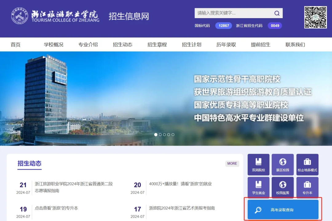 进入浙江旅游职业学院招生信息网(https://zs.tourzj.edu.cn/)在页面右下角"高考录取查询″栏输入考生姓名与身份证即可查询。