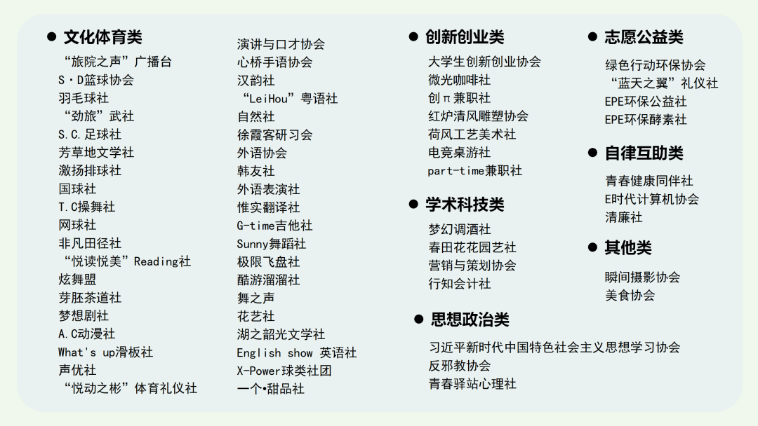 浙江旅游职业学院目前共有62个社团。社团像是大学生活中的一束彩色的光,丰富着我们的课余生活。同学们可以根据自己的兴趣爱好或是想锻炼的方向,选择相对应的社团。