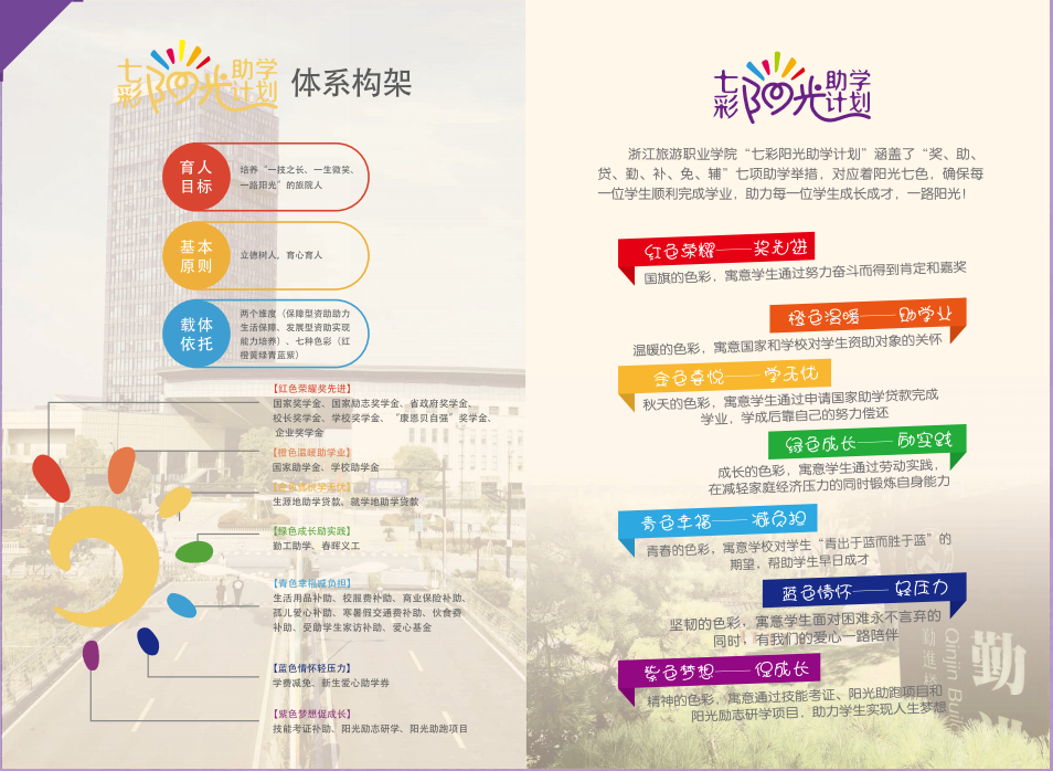 ●资助政策体系完善:学校丰富的资助政策兼顾了救济性、保障性和发展性,秉承“资助”和“育人”并举、“全覆盖”和“精准”并重的理念,形成了项目丰富、具备学校特质的“七彩阳光助学计划”资助体系。“七彩阳光助学计划”分“奖、助、贷、勤、补、免、辅”七大模块,40余项资助政策。包含有国家奖学金、国家励志奖学金、浙江省政府奖学金、校长奖学金、优秀学生综合奖学金、优秀学生单项奖学金和各类专项奖学金,国家助学金、学校助学金、国家助学贷款、勤工助学、爱心基金,面向特别困难的学生提供新生生活用品费补助、新生校服费补助、商业保险补助、伙食费补助、寒暑假交通费补助、学费减免,并设有提升学生技能与综合素质的阳光助跑项目资助、阳光研学项目、技能考证补助、赴国(境)外交流学习经费资助等资助政策,建立了大学新生“绿色通道”制度。此外,学校为解决低保、残疾、失业等困难家庭学生及灾区学生入学难问题,特设立了“新生爱心助学券”,只要符合条件的新生都可以申请,享受学费资助。