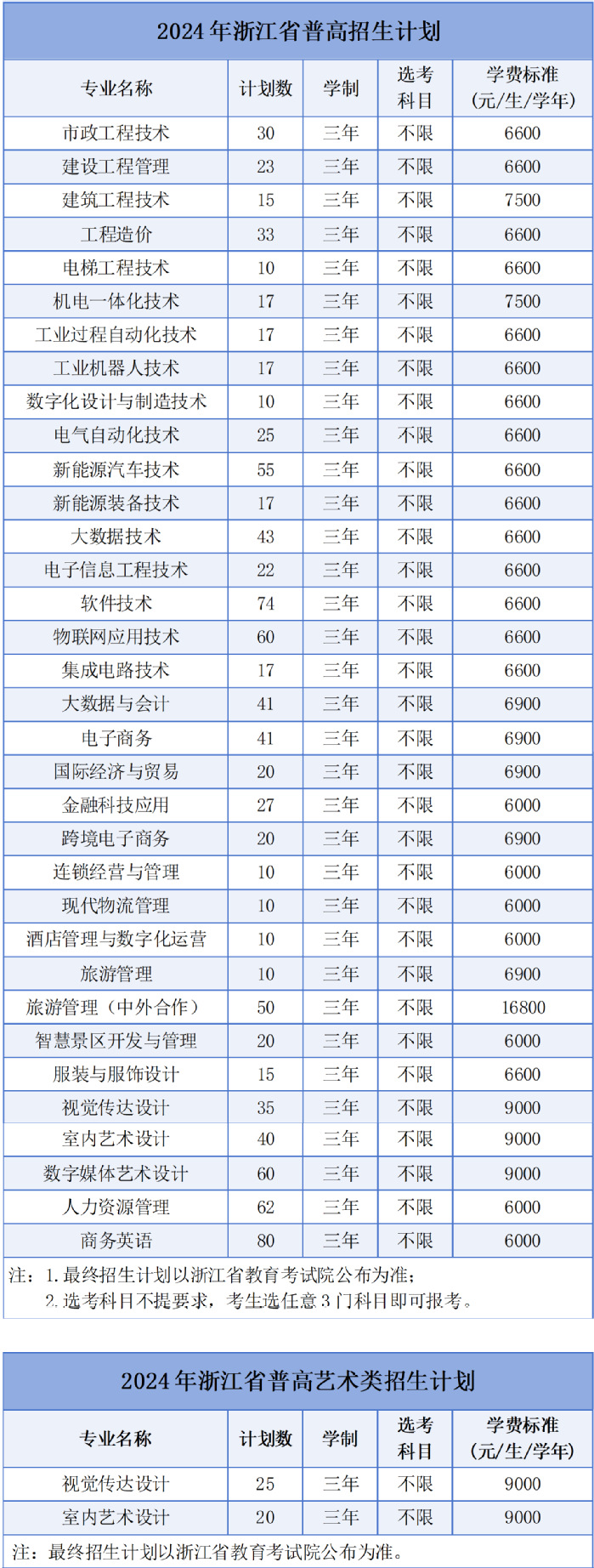 湖州职业技术学院2024年浙江省普通类、艺术类招生计划