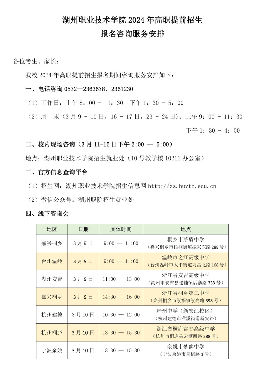 湖州职业技术学院2024年高职提前招生报名咨询服务安排