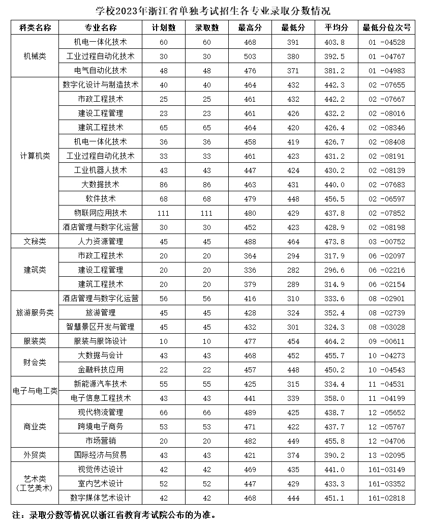 湖州职业技术学院2023年浙江省单独考试招生各专业录取分数情况